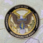 1st Special Forces Group Series 3, 2.5″ Mega Coin. Features the US Army Special Forces Regimental Eagle on a cutout coin, with 1st Group Flash, DUI and SF SSI.