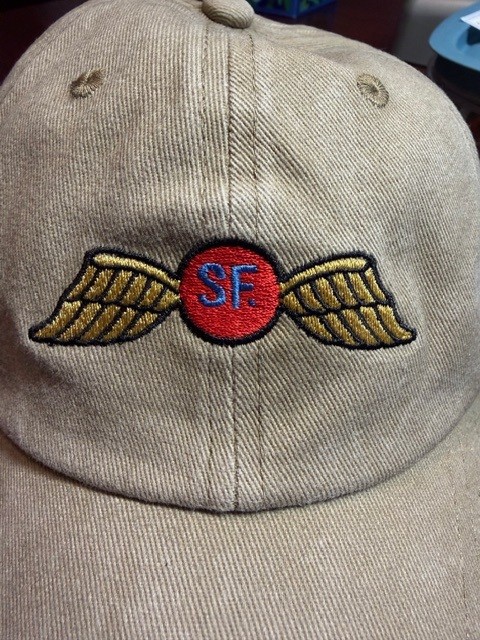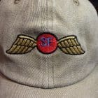 Jedburgh Logo Khaki Low Pro Hat Khaki Low Pro Hat. Khaki colored, soft material with buckle adjustment and strap. This hat features the Jedburgh logo with metallic gold wings and Light Blue SF. letters.