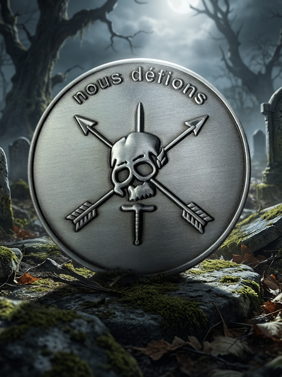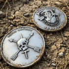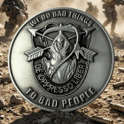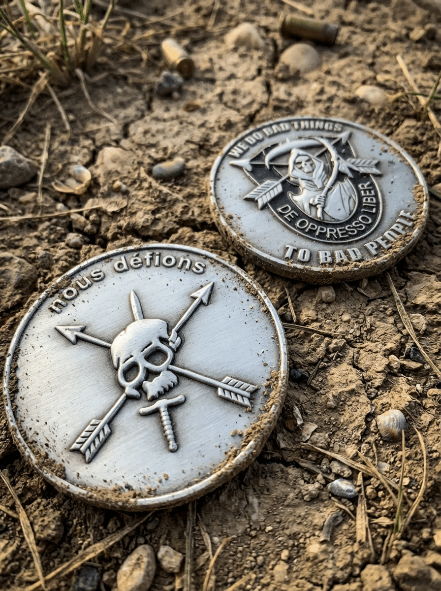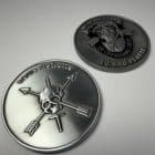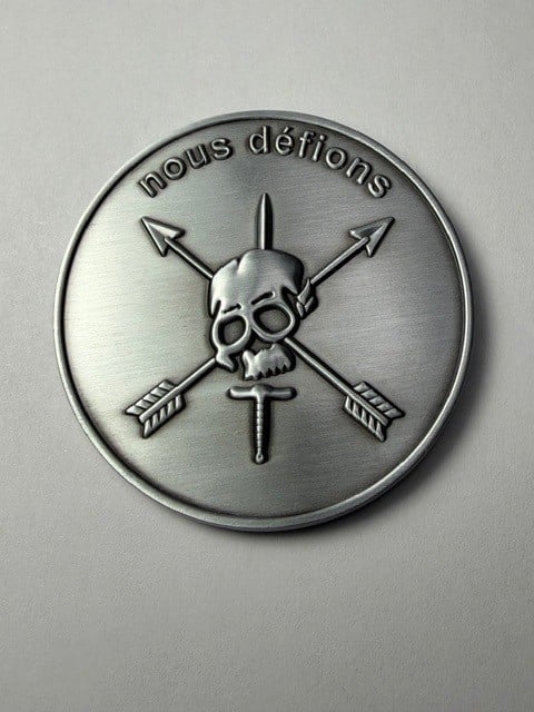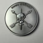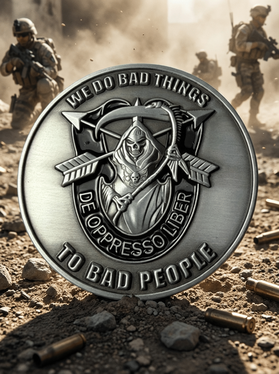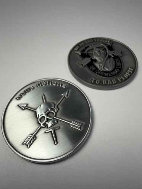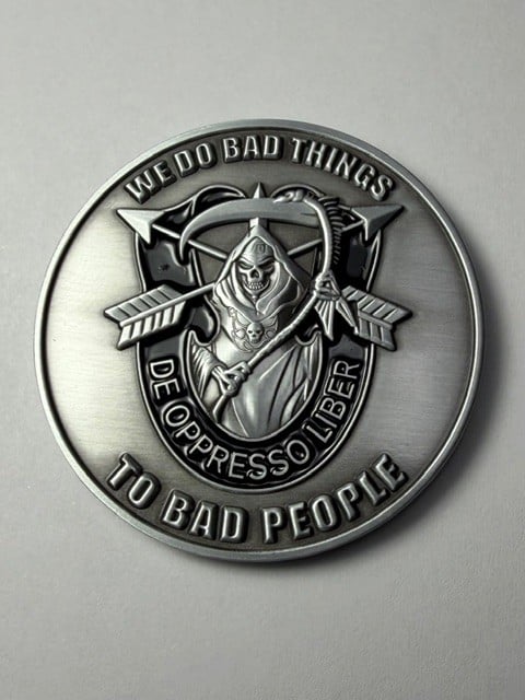 Special Forces Nous Defions “Reaper” 2″ – Anti Matter Finish. Nous Defions Logo on Front and SF “De Oppresso Reaper” image on reverse in full 3D. Text on coin edge “WE DO BAD THINGS TO BAD PEOPLE”